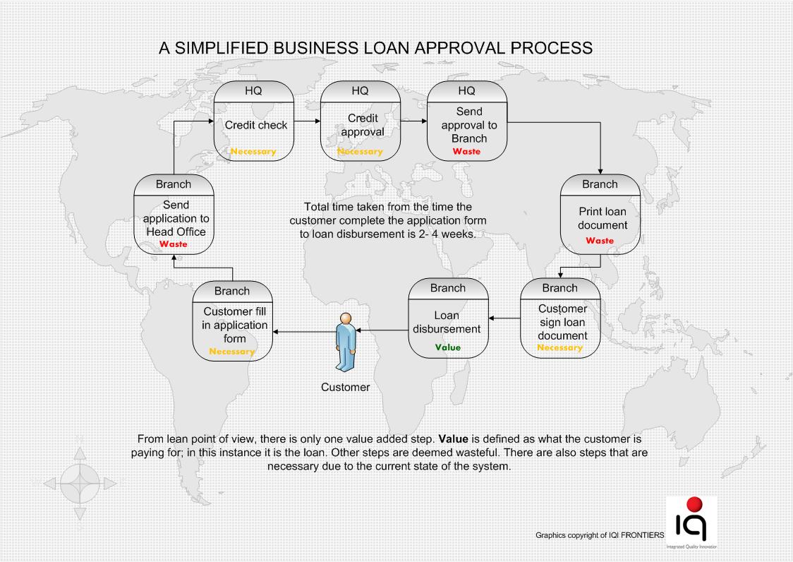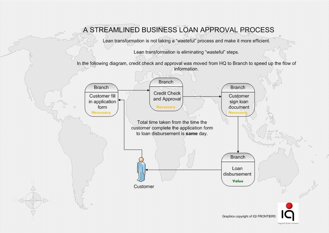 In this second illustration, 5 steps in the process were removed. The credit check and approval process were combined and the operation takes place in the branch and not at HQ. By doing this there are less information hold ups and faster processing time which eventually delights the customer. Loan processing time is reduced from 2-4 weeks to 1 day!